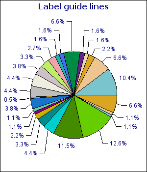 For very busy Pie plots it can become too little space for the labels to be printed just beside the pie slice. For this purpose it is possible to use guide lines for the labels. The library will then draw a line from the center edge of the slices to the label which will be positioned further out from the Pie Plot.